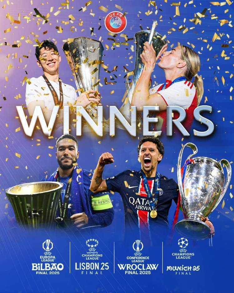 至此,欧足联旗下四大赛事冠军已尘埃落定。欧足联官方社媒祝贺四大赛事冠军得主,分别是欧冠冠军大巴黎、欧联冠军热刺、欧协联冠军切尔西、女足欧冠冠军阿森纳。